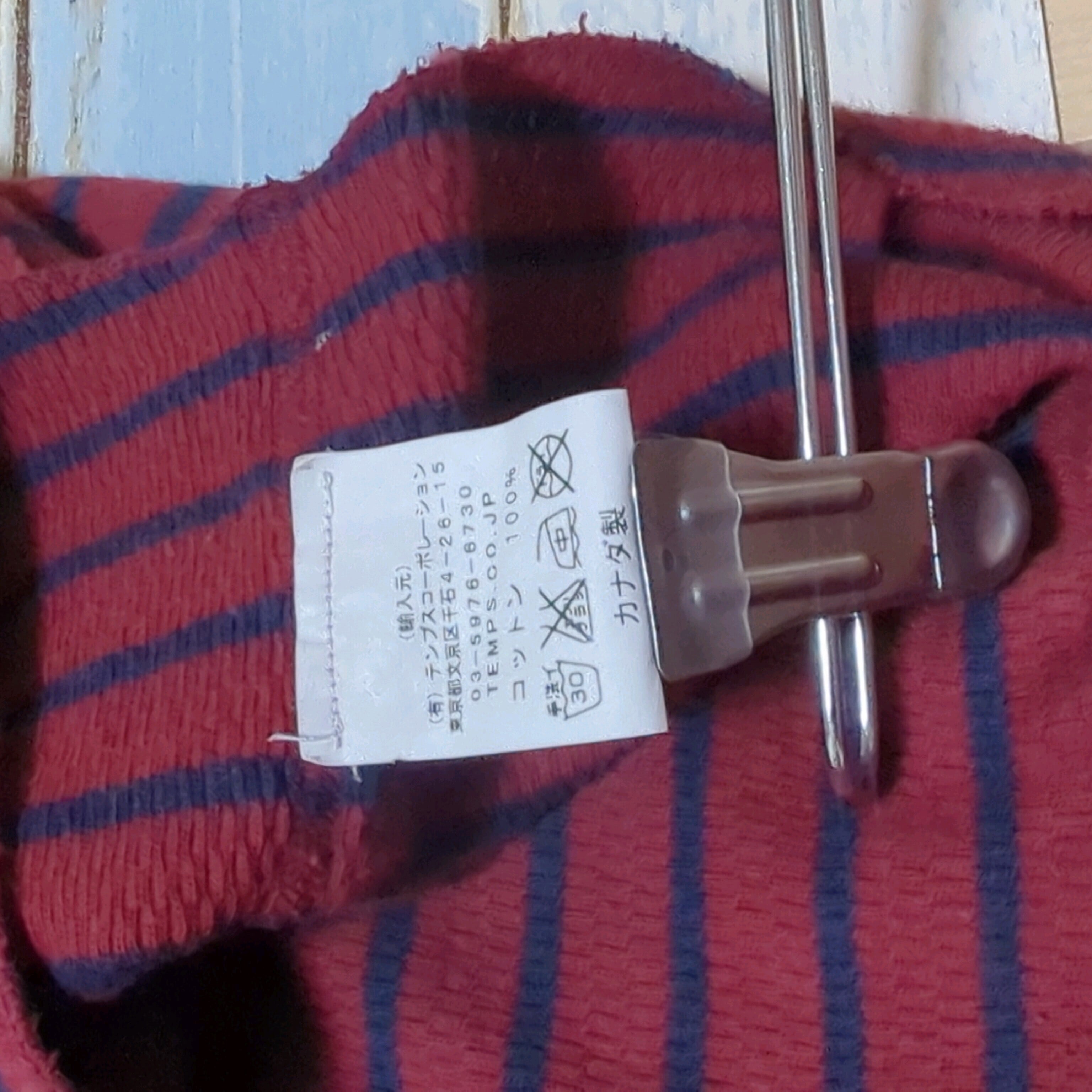 - 色: 赤と紺のストライプ