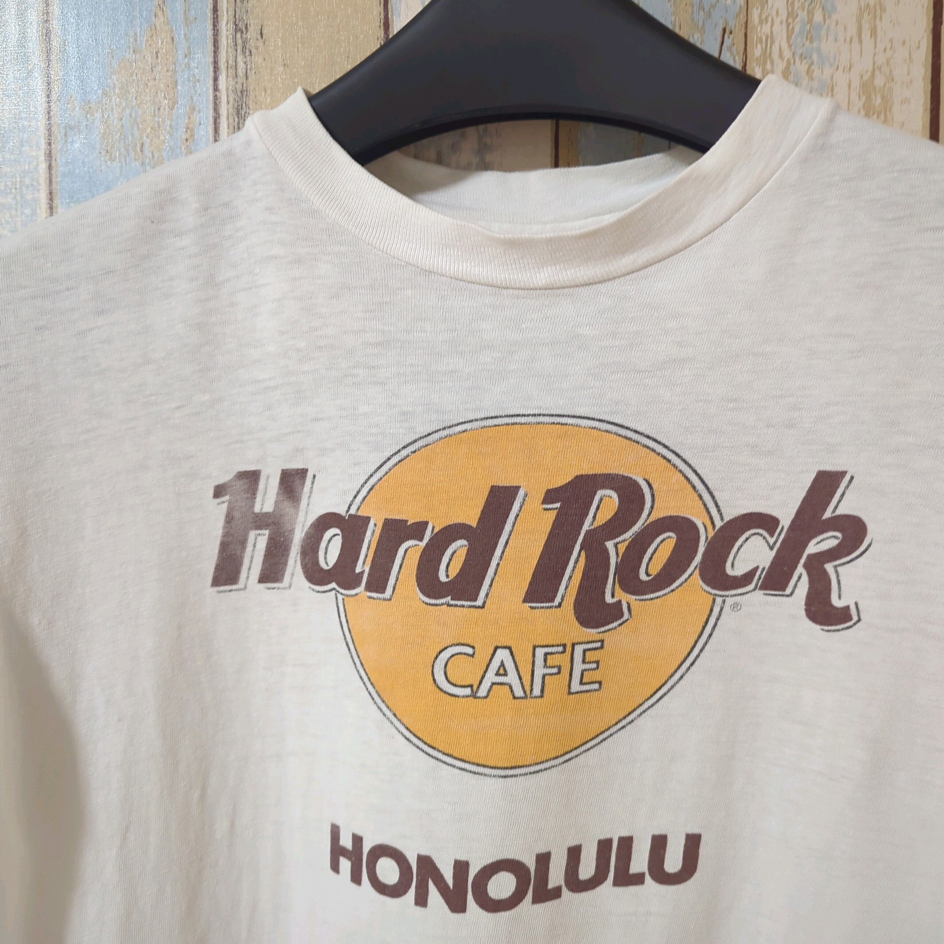 アイボリーのHard Rock Cafe Tシャツ、HONOLULUデザイン、USA製。