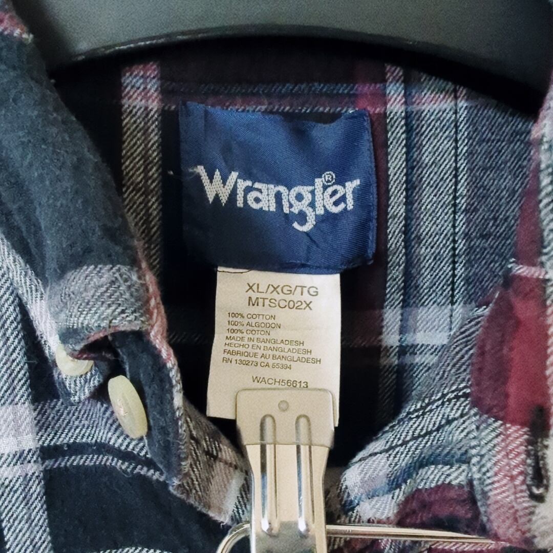 チェック柄のWrangler長袖ネルシャツ、前面に2つのポケット付き。