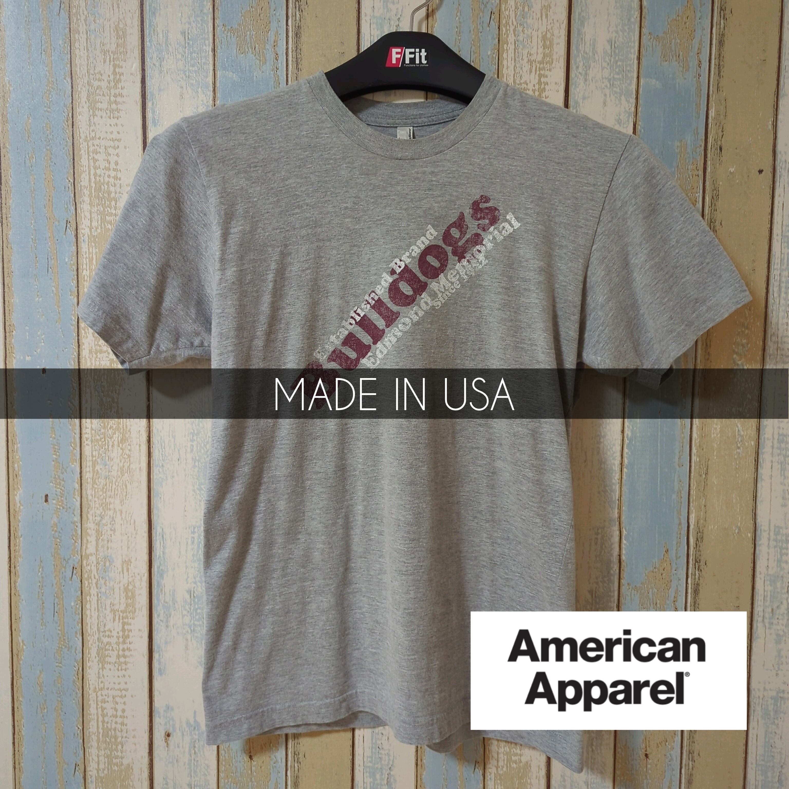 アメリカ製のグレーTシャツ、Bulldogsデザイン付き。