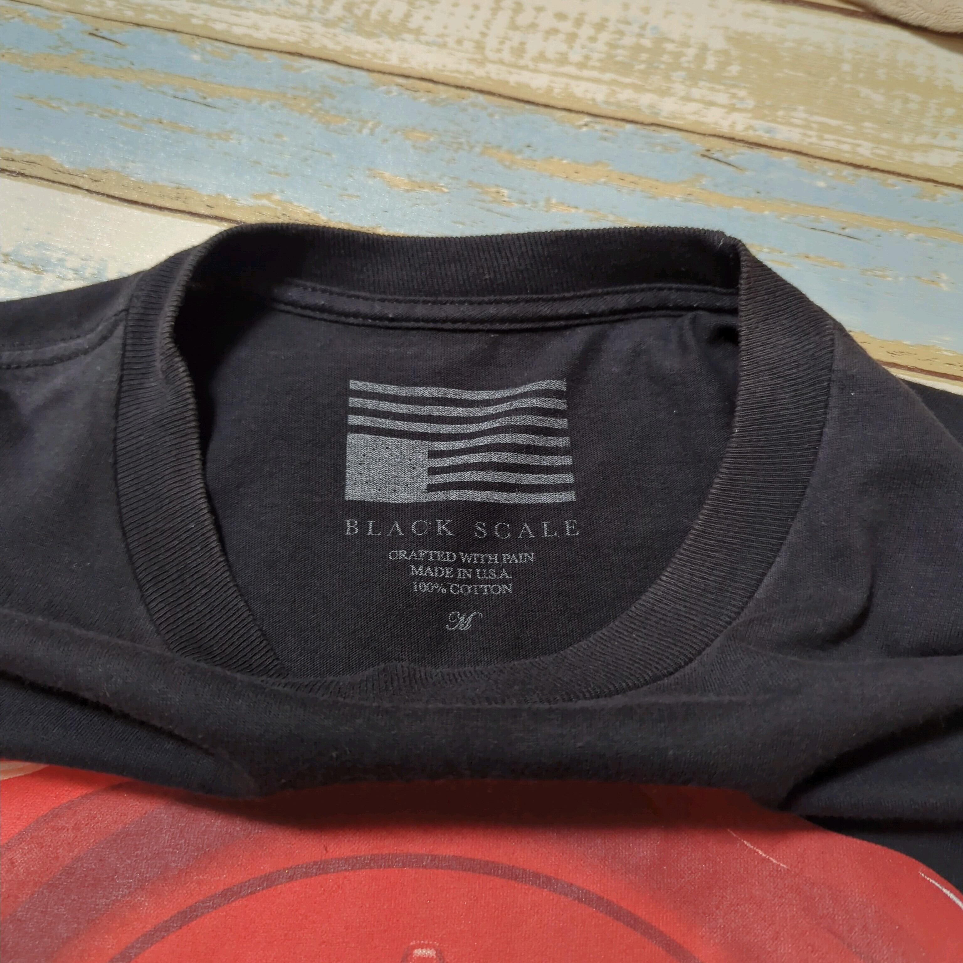 アメリカ製のBLACK SCALEのブラックTシャツ、赤いワックスシールロゴが特徴。