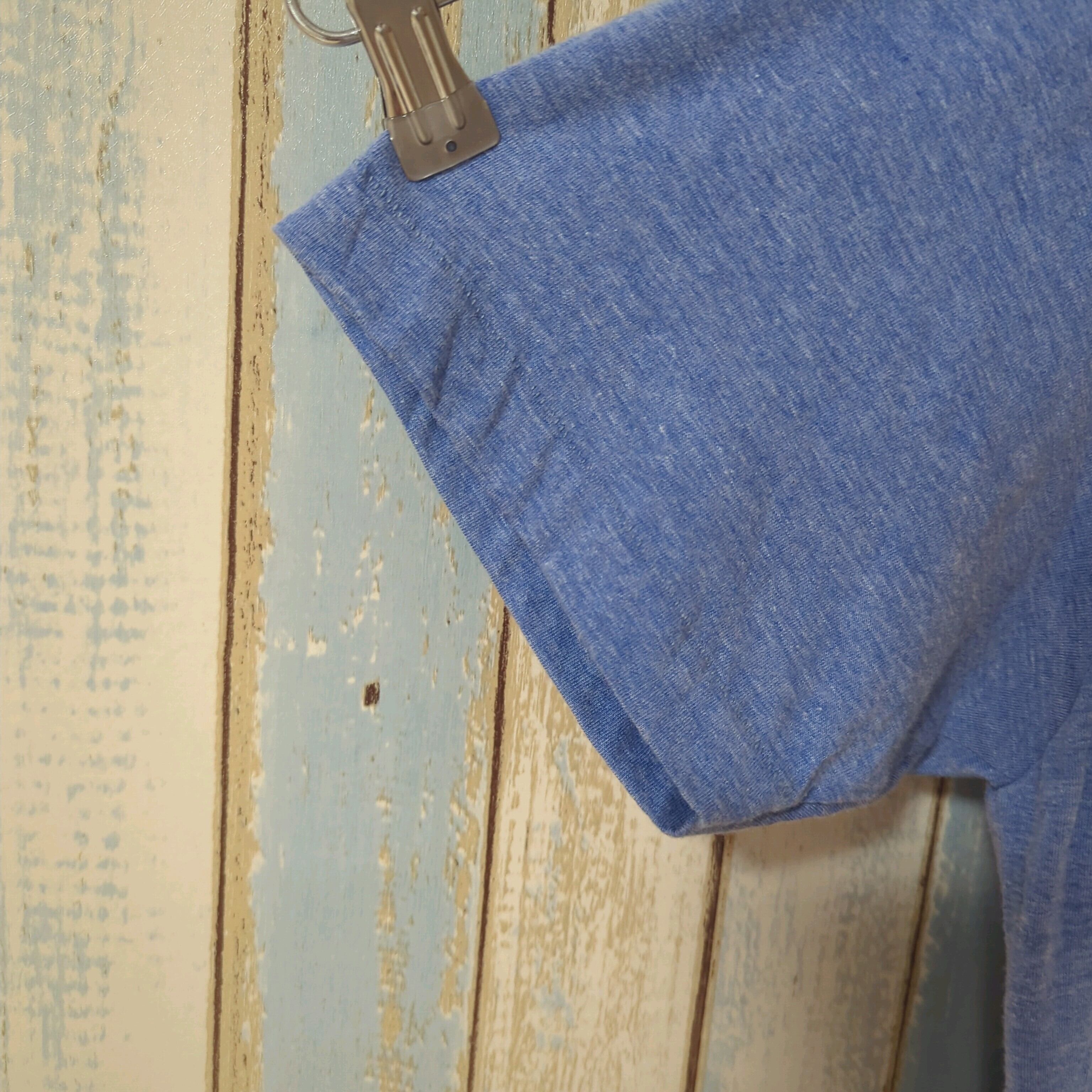 アメリカ製の青いTシャツ、プリントデザイン付き。