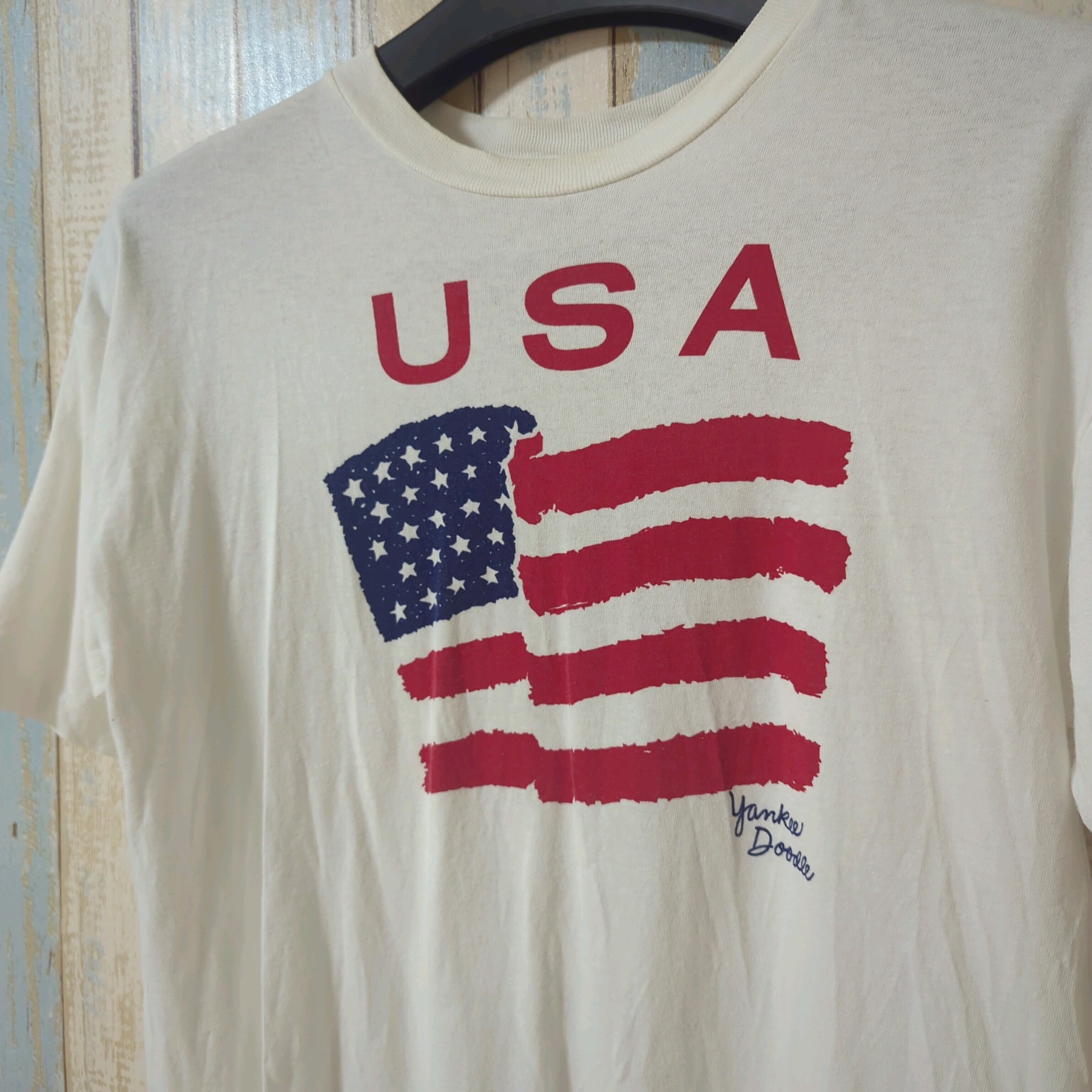 アメリカ製のUSA国旗プリントTシャツ、コットン素材で快適な着心地。