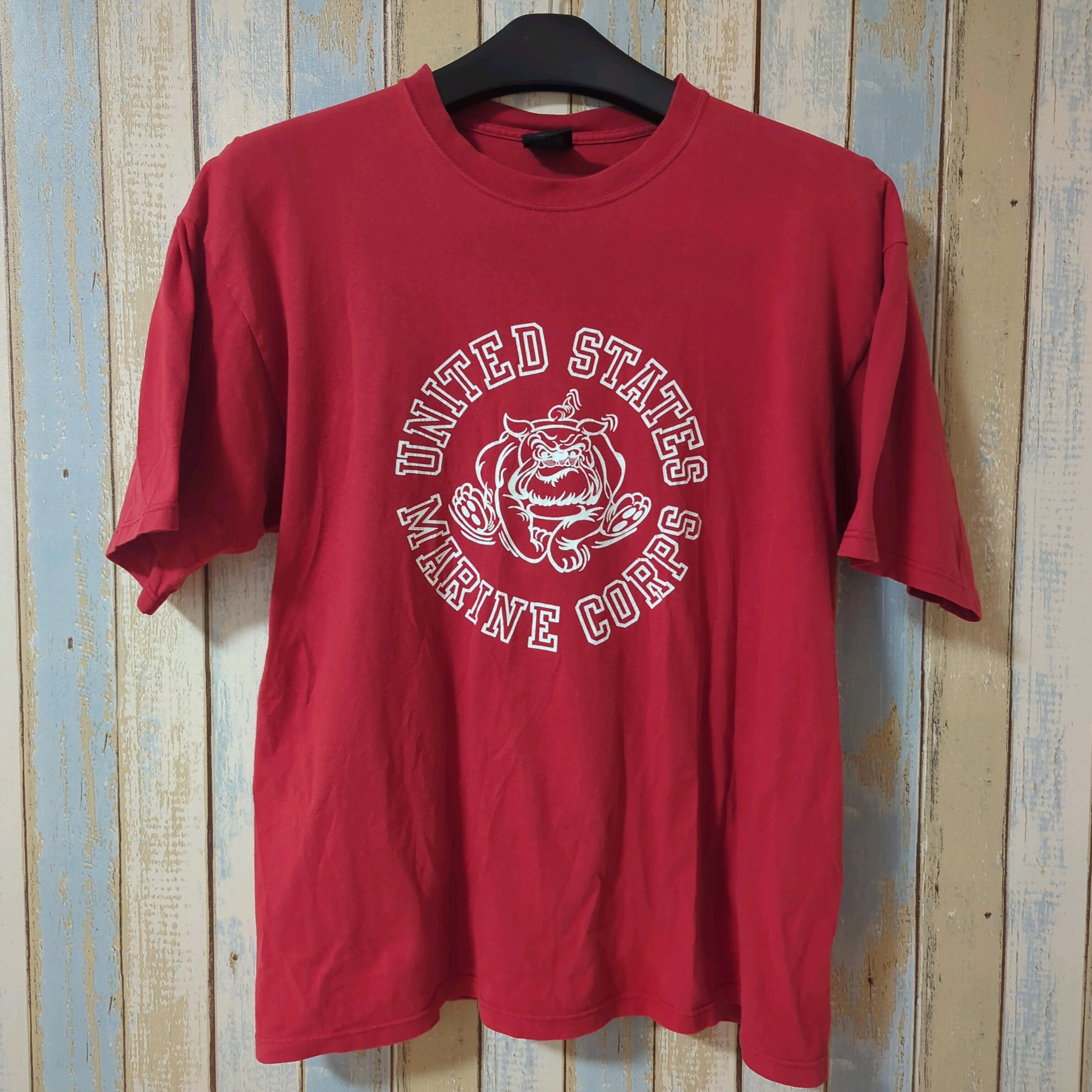 United States Marine Corpsのロゴが施された赤いTシャツ。